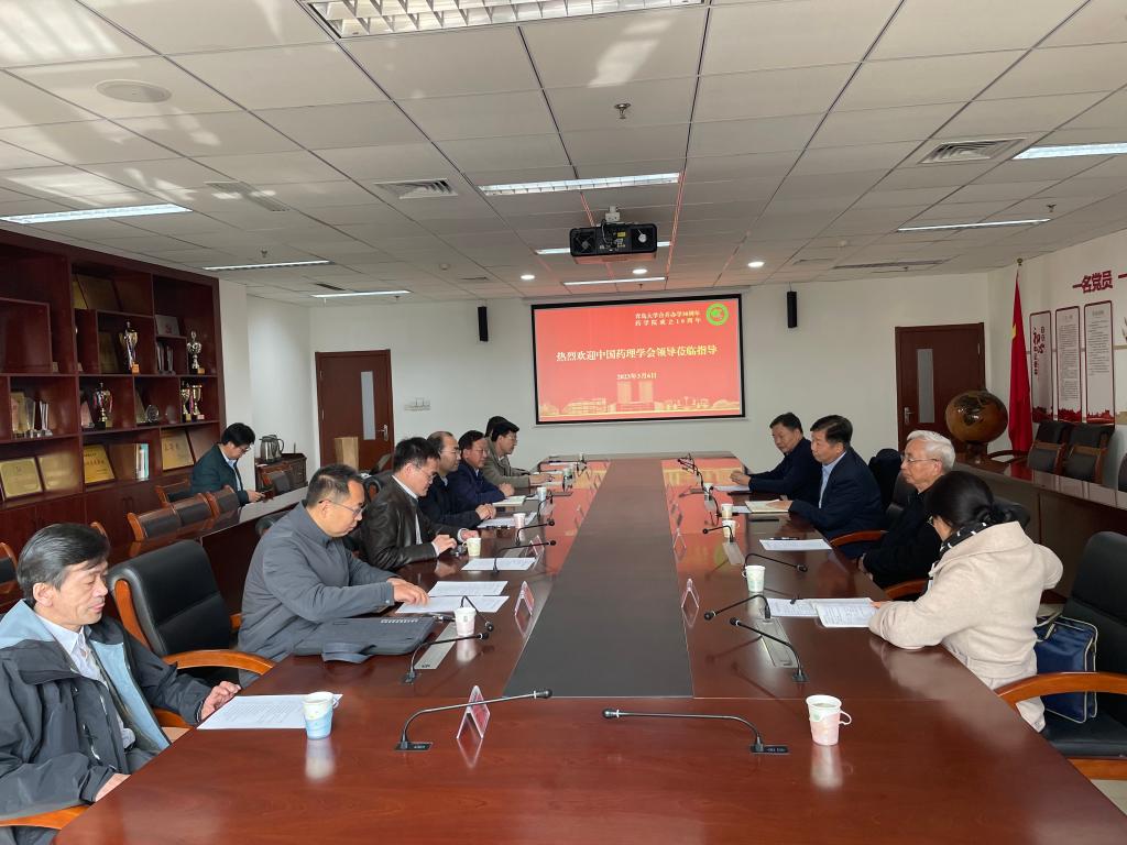 党政领导班子成员于浩园医学教育综合楼A215会议室与中国药理学会理事长张永祥,党委书记杜冠华,名誉理事长林志彬及常务理事兼副秘书长、网络药理专业委员会主任委员周文霞一行进行交流。双方围绕“医学+”及药学学科建设发展等工作进行了会谈。