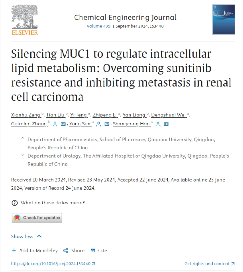 药剂学系孙勇教授团队与青岛大学附属医院泌尿外科张桂铭主任医师合作,在肿瘤靶向基因药物递送研究方面取得新进展,相关研究成果以“Silencing MUC1 to Regulate Intracellular Lipid Metabolism: Overcoming Sunitinib Resistance and Inhibiting Metastasis in Renal Cell Carcinoma”为题发表在《Chemical Engineering Journal》(中科院期刊分区1区top期刊,IF=13.3)。该研究得到了国家自然科学基金委、山东省自然科学基金委等项目的资助。本文第一作者为8868体育app
