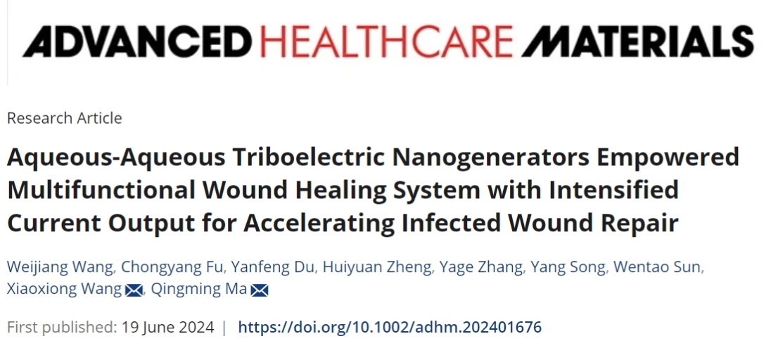 王晓雄教授团队基于双水相体系的液-液相分离原理,构建了新型水-水摩擦电纳米发电机(A-A TENG)。凭借其独特的水相摩擦层材料物理性质,保证了高效、完全的接触与分离过程,显著提升了输出电流密度。在此基础上,利用A-A TENG的高电信号输出作为治疗性电刺激,开发了新型多功能伤口愈合体系:A-A TENG产生的电信号通过导线传输至贴附在伤口上的导电水凝胶,确保电场的均匀性和稳定性;增强的电流输出不仅可以直接调节细胞迁移行为,还可以增强抗菌作用,从而在创伤愈合的多个阶段发挥重要作用,全流程加速创伤愈合。A-A TENG展现了一种新型TENG的全貌,其超高的电流输出密度、独特的接触分离方式以及摩擦层的生物安全性不仅为创伤愈合提供了新的选择,而且预示着其在多个生命科学领域的潜在重要作用。该项工作以“Aqueous-Aqueous Triboelectric Nanogenerators Empowered Multifunctional Wound Healing System with Intensified Current Output for Accelerating Infected Wound Repair” 为题发表在国际权威学术期刊《Advanced Healthcare Materials》(1区TOP,IF=11.092)。8868体育app