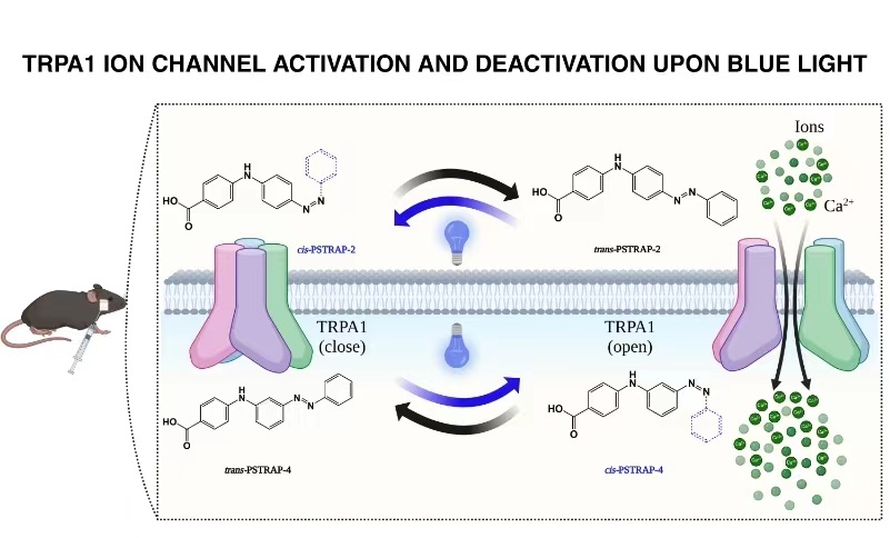 光药理学(Optopharmacology)是一种结合光学技术和药理学的新兴交叉学科,旨在通过光控手段精确调控药物的活性、释放或作用位点,以实现对生物过程的高时空分辨率控制。该团队继开发小分子光开关配体1g、2c通过TRPA1通道脱敏实现对疼痛的光调控之后(Qiao et al.,J. Med. Chem., 2021, 64, 16282),进一步开发了靶向TRPA1的小分子开关配体PSTRAP-2和PSTRAP-4。新型光开关配体能够高时空分辨率、可逆性地调节TRPA1离子通道功能,通过蓝光与黑暗之间的切换激活或去激活表达在CHO细胞上的TRPA1电流,并在小鼠脸颊疼痛模型中,通过皮内注射光开关PSTRAP-2和PSTRAP-4对TRPA1进行光化学门控,从而使诱导的疼痛感知随光的开-关而周期变化。这一研究成果发表在British Journal of Pharmacology期刊。