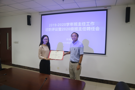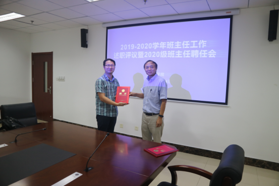 会议首先进行2019-2020学年班主任工作述职评议。12位班主任以PPT形式图文并茂汇报了工作思路、工作举措和工作成效,分析了工作中存在的问题,提出了新学年工作思路和打算。汇报人现场回答了与会领导提出的问题。会议进行了现场评议打分。随后,院长王克威为2020级班主任卢炜、王惠老师颁发聘书。