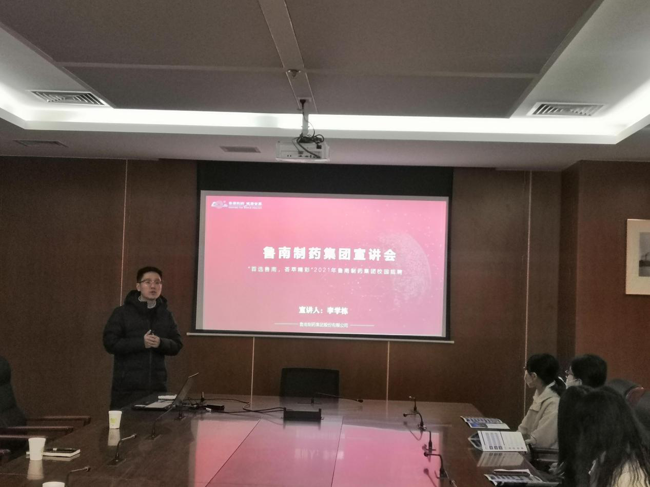 在浮山校区医学教育综合楼A110会议室举办鲁南制药集团校园招聘宣讲会。鲁南制药招聘经理李学栋、陈为星,厚普药物研发中心职员刘思延、郝妍斐,贝特药物研发中心分析组负责人王中超到院宣讲,8868体育app