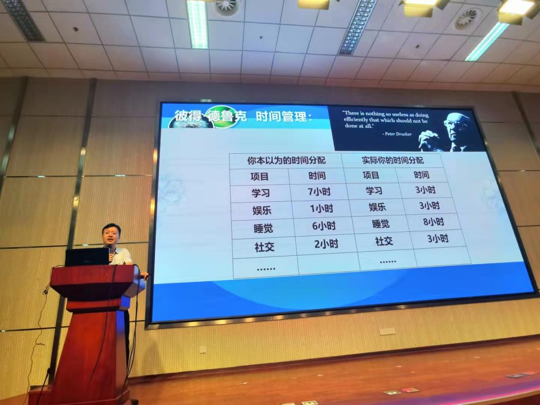 历年来推荐免试攻读硕士研究生情况、学业预警、奖惩等情况,以大量的数据和实例列举了学生在时间管理方面的认识误区和行为偏差,以“一年365天,有多少时间可以用来学习?”、管理大师德鲁克的有关研究条分缕析引导同学们深入思考,清晰认识。针对新生易于困顿的学习与工作、学习与交际等方面深入交流“相信我,所谓的人脉就算重要,也根本没他们说的那么重要”,告诉同学们“ 承认自己能力有限,是心理健康的前提。”“要不怕在别人面前露怯;敢于不去证明自己是“好人;要去学习如何做事量力而行……””并真诚提出5点建议:1.专心做可以提升自己的事情;学习并拥有更多更好的技能;成为一个值得交往的人;2.学会独善其身,以不给他人制造麻烦为美德;用你的独立赢得尊重;3.除非有特殊原因,应该尽量回避那些连在物质生活上都不能独善其身的人;那些精神生活上都不能独善其身的,就更应该回避了——尽管甄别起来比较困难;4.真正关心一个朋友的意思是说,你情愿在他身上花费甚至浪费更多的时间;5.记住,一个人的幸福程度,往往取决于他多大程度上可以脱离对外部世界的依附。强调,学习是学生的天职,学习成绩是一切的基础,告诫同学们要摆正关系,明确目标,做好规划,祝愿新生同学们大学生活愉快充实。