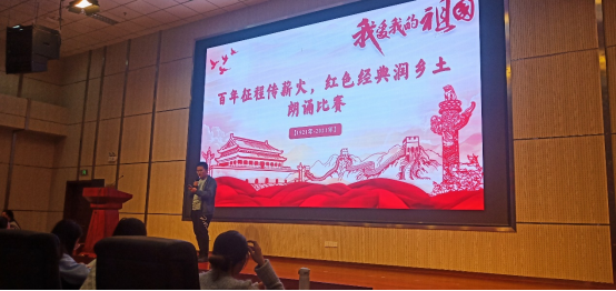 在浩园医学教育综合楼一楼学术报告厅举办“百年征程传薪火,红色经典润乡土”朗诵比赛,读书社全体成员参加活动。