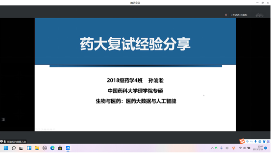 高慧展以复试重要性为开端,提醒学弟学妹们在与老师交流时要注意讲出自己的优势,强调实践能力。他结合自身经历,按药物化学、药剂学、天然药物化学等方向细致分析今年的山东大学试题,着重强调了笔试时间紧任务重;面试录取结果与面试时间长短无关,对专业相关英语口语要求高等特点,并提醒大家复习时挑重点记忆,面试时着装可日常但不要随意,稳住心态,注意举止仪态等。