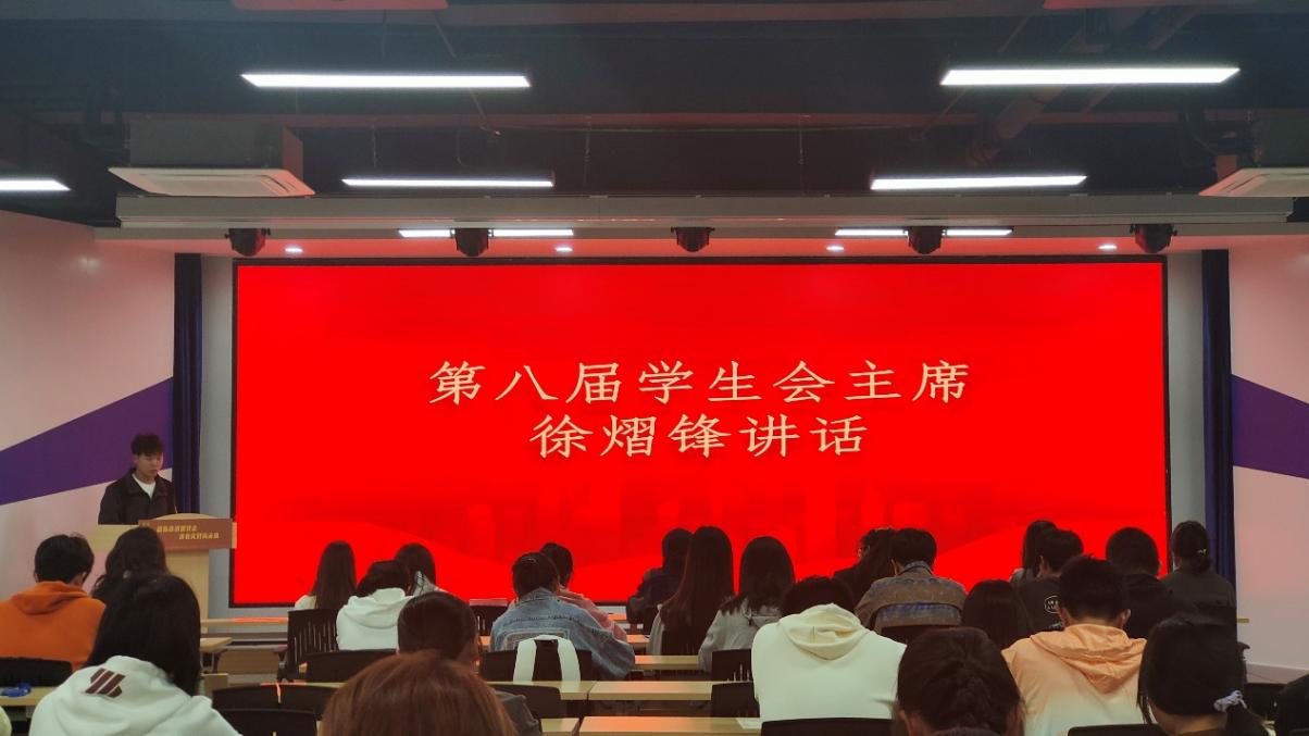 第八届学生会主席徐熠锋同学致辞。他强调:一、新一届学生会全体成员应“跑好接力赛”,做到敢想敢拼,不怕困难,勇往直前;二、学生会全体成员应做好广大同学与学校、社会的桥梁与纽带,秉承“全心全意为同学服务”的宗旨,在服务工作中提高综合素质,真正成为有理想敢担当肯吃苦的新时代青年;三、学生会全体成员要正确平衡学业和工作,做到二者的有机结合,修身律己,给自己一个不断学习成长的机会;最后,他期望所有同学都能勇于创新,保持好奇心和求知欲,在学生会这个大家庭中收获温暖,蜕变成长,共同谱写8868体育app