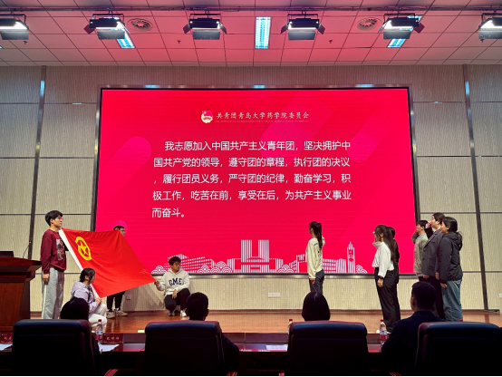 学生会主席于宛彤、研究生会主席向伟分别代表培训班学员发言,带领新团员进行入团宣誓。2023级本科生王素涵代表新发展团员发言。
