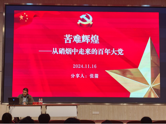 在第一场讲座中,张箭以“苦难辉煌-从硝烟中走来的百年大党”为主题。他以党的历次全国代表大会为线索带领学员们回顾党的发展脉络,讲述中国共产党的创建、投身伟大革命到迈进新时代的历程,用重要时间节点和关键历史事件带领大家清晰认识党的发展历程,并列举了不同时期优秀共产党员的先进事迹。通过这些故事,学员们认识到共产党员的先锋模范作用以及他们的忠诚品质,并坚定了向榜样学习的信念。张箭还聚焦当下历史背景,强调青年与党的关系密不可分,点明青年人作为国家的未来,应该红心向党,在党的思想光辉照耀下奋勇前进,坚定社会主义核心价值观,为党和国家的繁荣发展贡献力量,积极投身国家建设,争做新时代青年。