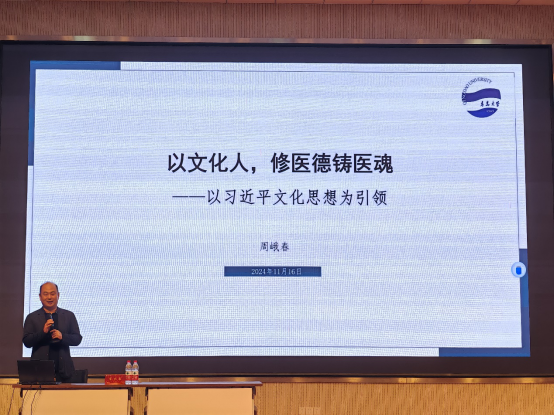 在第二场讲座中,周峨春老师以“以文化人,修医德铸医魂--以习近平文化思想为引领”为主题,从习近平文化思想的发展和内涵、如何弘扬中华优秀传统文化以及中医药文化赋予医德医风极其广阔的历史高度与深度的方面将“习近平文化思想”与“修医德铸医魂”紧密联结起来。周峨春老师还展示了央视《典籍里的中国》伏生以命护《尚书》的桥段、中华优秀传统文化与当下社会治理结合典范“新时代六尺巷工作法”、2022年北京冬奥会24节气宣传片、让曹县再度“出圈”的马面裙、美国“90”后武当学武等中华优秀传统文化传承典范。同时,周峨春老师分享了“人与人,人伦和睦”这一心得,亲切地讲述自己与学生和睦相处,在平时的交流中做到诚信友善,互相尊重欣赏的故事。最后,周峨春老师分享了泰戈尔的诗《用生命影响生命》,“愿每个人都能活成一道光,绽放着所有美好。”