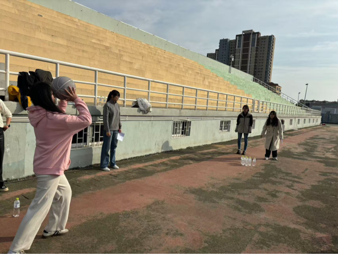 该项目考验同学们的篮球技巧与团队合作精神。参赛的各组成员将轮流用篮球击打摆放在场地上的水瓶,目标是尽可能多地击倒水瓶。
