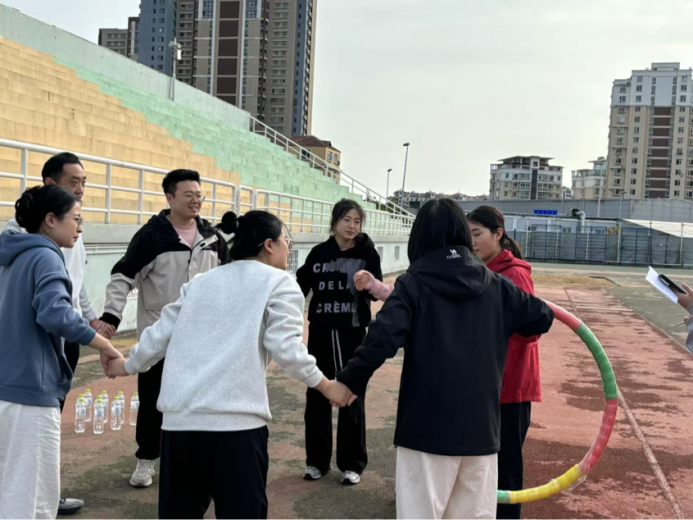 此项目考验团队协作能力,小组成员需手牵手传递呼啦圈。在比赛开始前,各个小组都进行了充分的热身准备,在正式比赛过程中,各队都以较快的速度顺利完成。