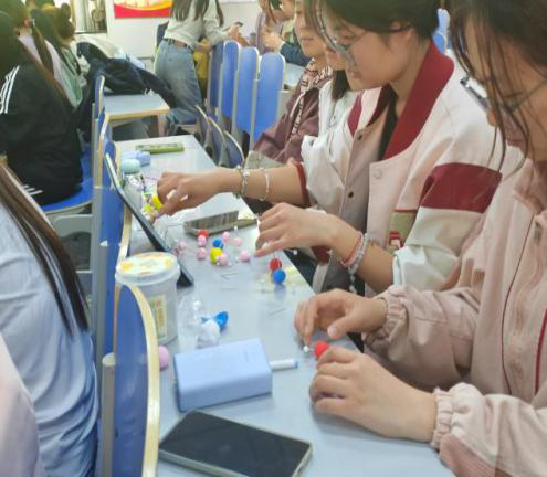 材料分发完毕,各参赛小组正式进入限时创作环节。活动采用"5分钟构思+20分钟搭建"的赛制,要求选手运用橡皮泥与牙签构建药物分子球棍模型。阿司匹林、青蒿素等经典药物分子结构在同学们手中逐步成型,既有对分子结构的精准还原,又不乏艺术化的创意表达。