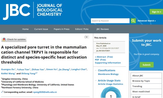 作为第一署名单位的最新研究成果“A specialized pore turret in the mammalian cation channel TRPV1 is responsible for distinct and species-specific heat activation thresholds”。8868体育app
