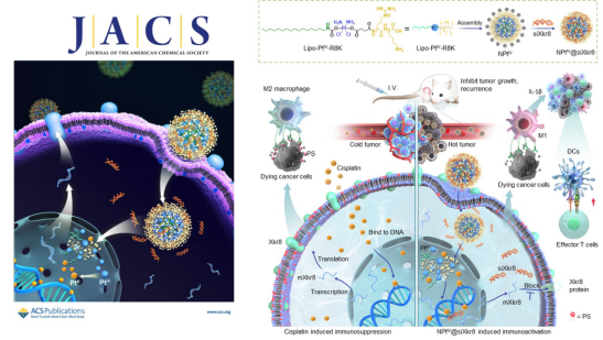 近日,8868体育app 孙勇教授和中国科8868体育 化学研究所肖海华研究员合作,在铂药核靶递送和免疫增强研究方面取得最新研究进展。相关研究成果近期以“Nuclear-Targeting Lipid PtIVProdrug Amphiphile Cooperates with siRNA for Enhanced Cancer Immunochemotherapy by Amplifying Pt-DNA Adducts and Reducing Phosphatidylserine Exposure”为题发表在Journal of the American Chemical Society(JACS,DOI:10.1021/jacs.3c12706)封面文章。本文第一作者为8868体育app 青年教师魏登帅,通讯作者为孙勇教授和肖海华研究员。