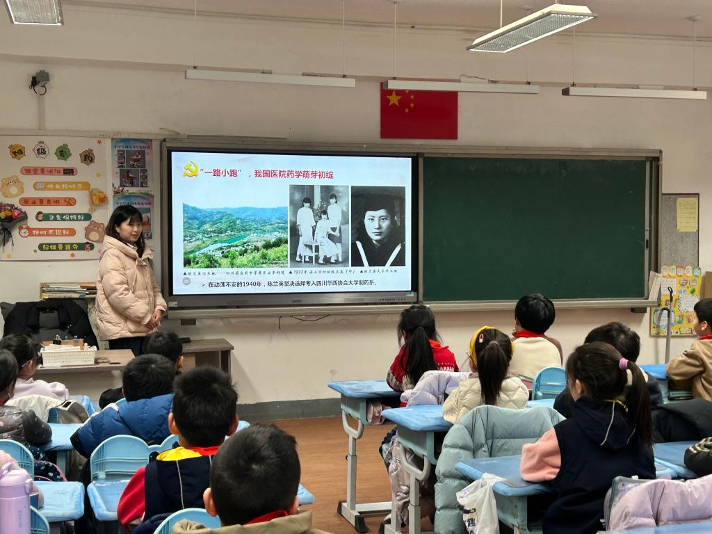 宣讲团的成员们通过生动有趣的讲述、图文并茂的展示,将医药行业先辈顾方舟、陈兰英和彭司勋的故事娓娓道来,让在场的每一位小学生都能深刻感受到这些先辈们在科研攻关、疾病防治等方面所展现出的非凡勇气、智慧与无私奉献。