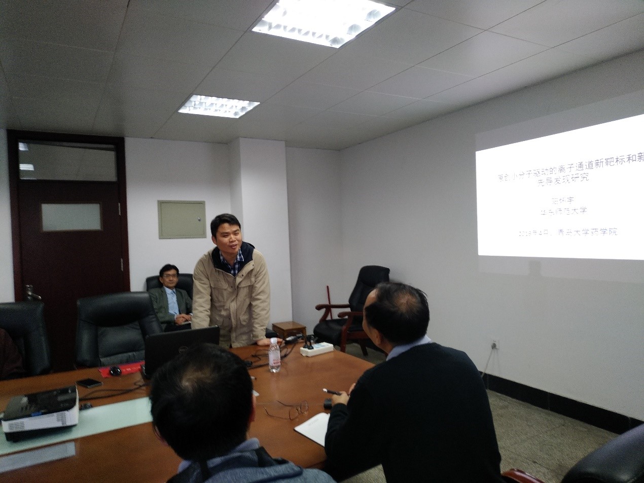 2019年4月15日上午10点,华东师范大学生命科学8868体育 阳怀宇教授莅临我校,在松山校区综合楼3楼中厅会议室做了“原创小分子驱动的离子通道新靶标和新先导发现研究”的报告,报告由王克威院长主持,8868体育app 二十多位师生参加了报告会。