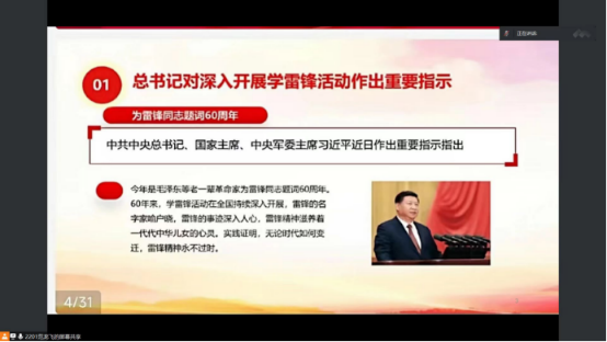 本次会议由四个方面展开,分别为雷锋介绍、雷锋事迹、雷锋日记、雷锋精神。首先,范龙飞同学介绍了习近平总书记对深入开展学习雷锋活动作出的重要指示,引导同学们学习助人为乐、全心全意为人民服务的伟大雷锋精神。其次,范龙飞同学向大家讲述了雷锋同志的光荣事迹,阐释了雷锋精神对青年学生的重要影响。最后,他向同学们展示了雷锋名言,鼓励同学们要学习雷锋品质,发扬雷锋精神。