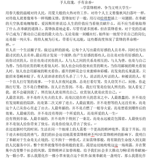 学习雷锋精神,让平凡的人生孕育出雷锋般的崇高精神,创造出明天的辉煌。希望同学们在今后生活中“对待他人要像春天一样温暖,对待学习像夏天一样火热,对待困难要像秋风扫落叶一样,对待不文明行为要像严冬一样残酷无情。”在雷锋精神的熏陶下,同学们能用雷锋精神鼓舞更多的人,做新时代雷锋精神的继承者与传播者!