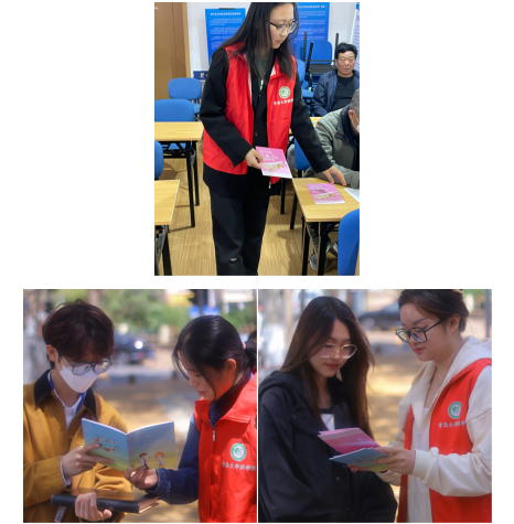 的同学们向社区居民分发药品安全使用说明书和儿童化妆品的安全宣传册。