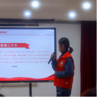 活动开始,牟晓彤同学依托新时代文明实践开展“党的二十大”宣讲报告。报告中,牟晓彤解读了党的二十大报告,阐述了二十大报告中的重大理论思想。她讲述了中国十年来取得的辉煌成就——从打赢脱贫攻坚战到实现全面小康社会,从民生福祉的提高到全面深化改革取得重大突破。每一份数据,每一组图片,都彰显着中国在这非凡的十年中取得的伟大成就。