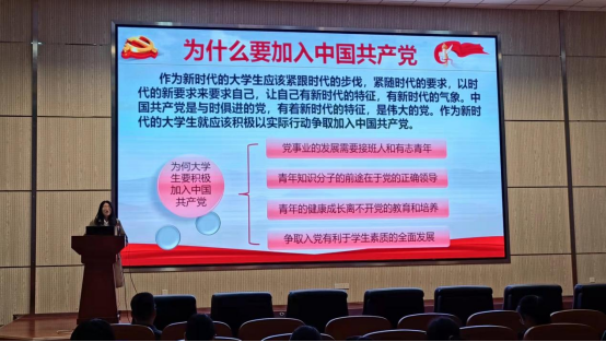 会上,王梦迪首先带领同学们一起学习了习近平总书记在庆祝中国共产党成立100周年大会上的讲话精神,向同学们介绍了党的基本知识,“为有牺牲多壮志,敢教日月换新天。”“一百年前,一群新青年高举马克思主义思想火炬,在风雨如晦的中国苦苦探寻民族复兴的前途。一百年来,在中国共产党的旗帜下,一代代中国青年把青春奋斗融入党和人民事业,成为实现中华民族伟大复兴的先锋力量。新时代的中国青年要以实现中华民族伟大复兴为己任,增强做中国人的志气、骨气、底气,不负时代,不负韶华,不负党和人民的殷切期望!”鼓励同学们加强学习,积极向党组织靠拢,以实际行动践行新时代责任担当。随后,王梦迪向同学们介绍了8868体育app